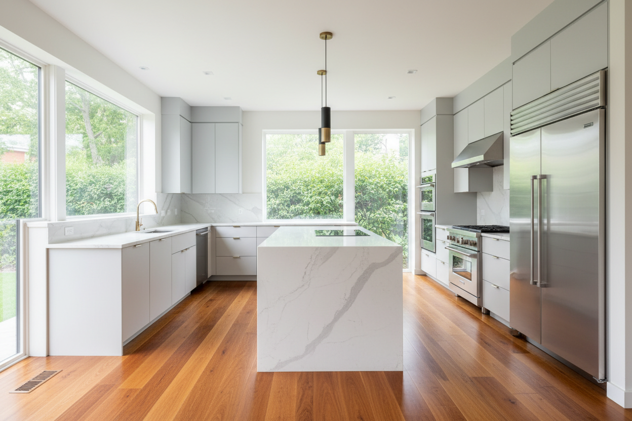 In the Canadian climate—where we face everything from humid summers to dry, heated winters—Engineered Hardwood is the superior choice for the kitchen. Unlike solid wood, engineered planks are constructed with a stable, layered core that resists the expansion and contraction caused by the humidity of a boiling pot or a dishwasher cycle.